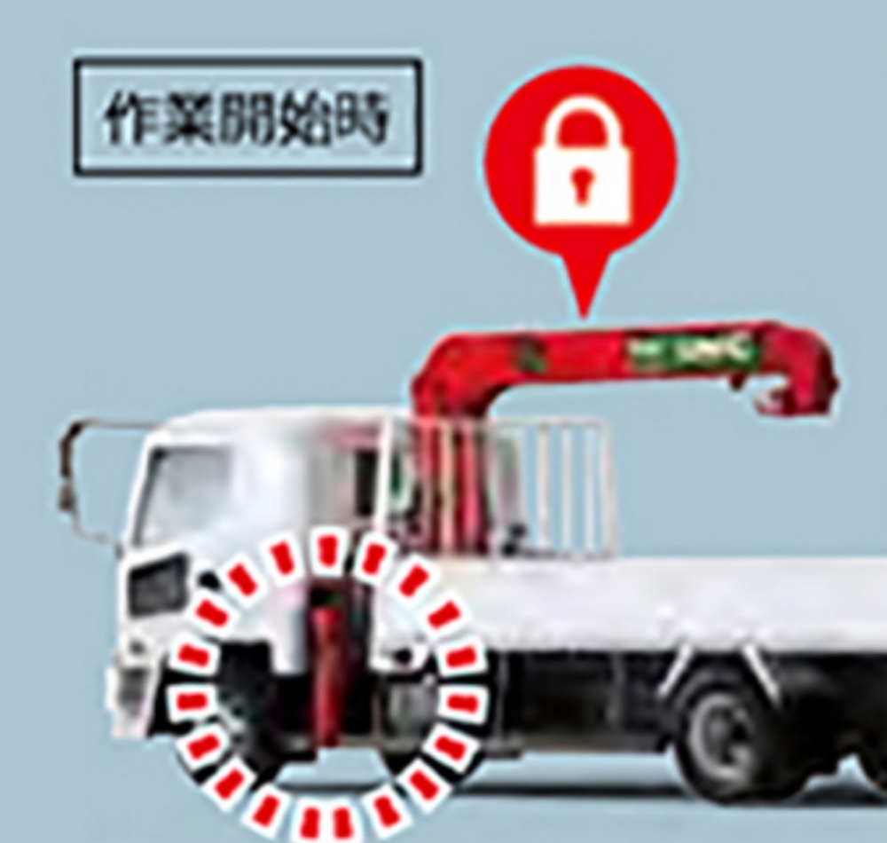 このブーム・アウトリガインターロック装置は、アウトリガ(足)を設置しないと、クレーンが作動せず、逆にクレーンを格納しないとアウトリガをしまえず、発進できないという仕組みになっています。